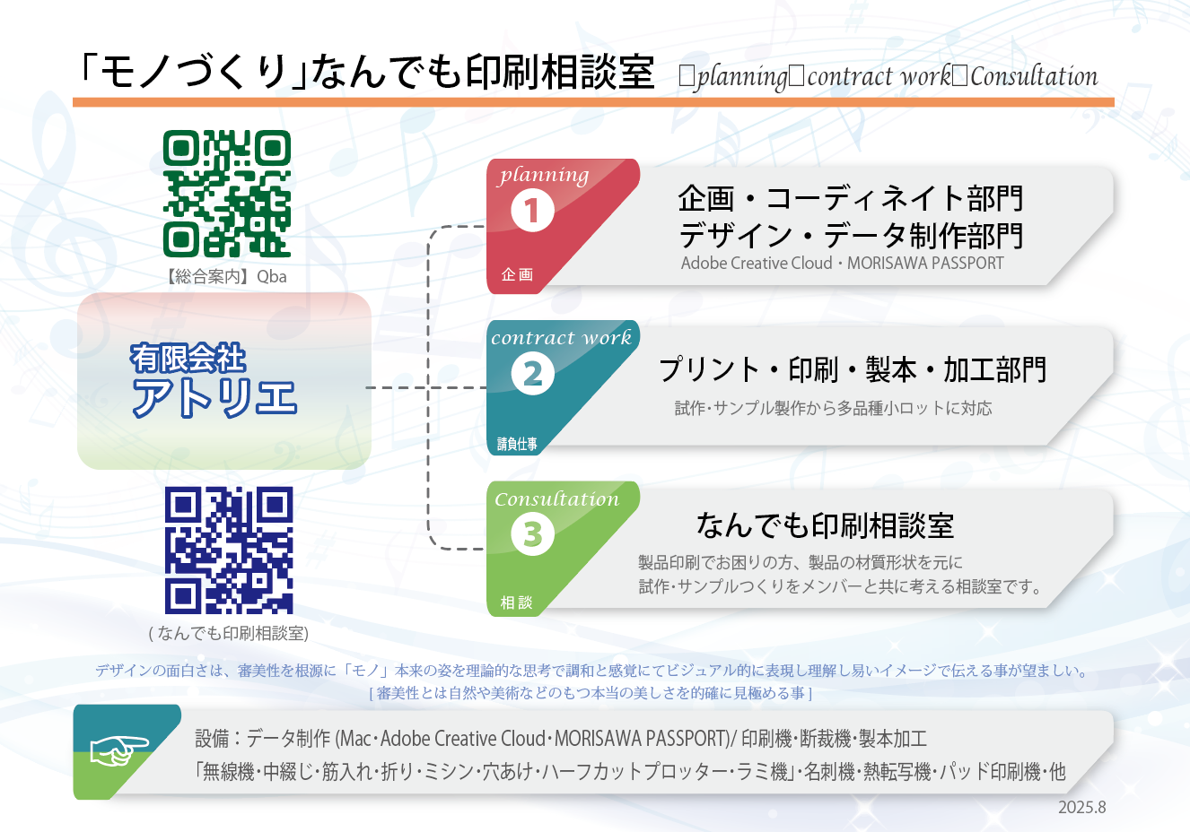 企画・デザイン・データ制作・一般印刷・転写プリントなど印刷に関してお困りの方、材質・形状・サイズ等に合わせ試作つくりを共に考える「なんでも印刷相談室」です。 サービス・技術・製品・商品などのデザイン制作からPRに関する情報を調整し、全体をまとめ、紙媒体とCHCを使い市場に配信するサポートをしています。